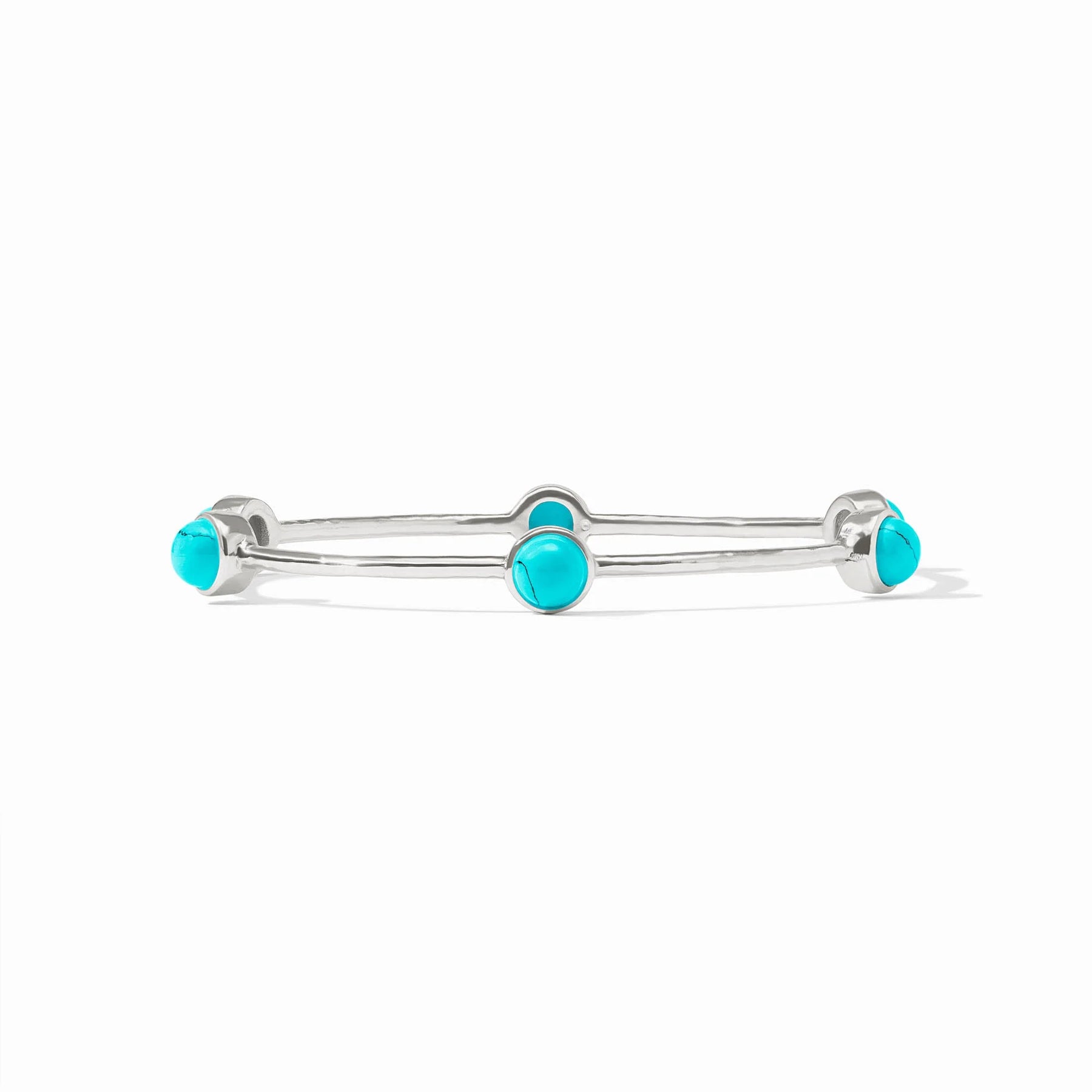 A lightly hammered bangle embellished with six iridescent gemstones. Pearl, imported glass, semi-precious stones, composed turquoise.