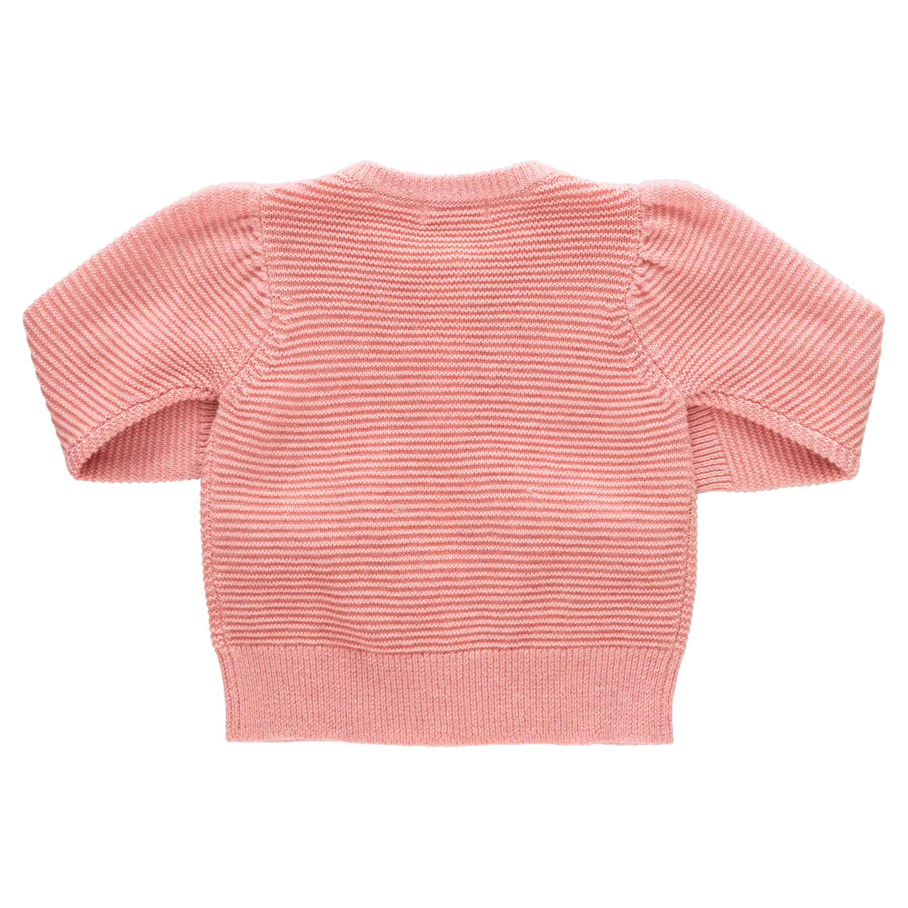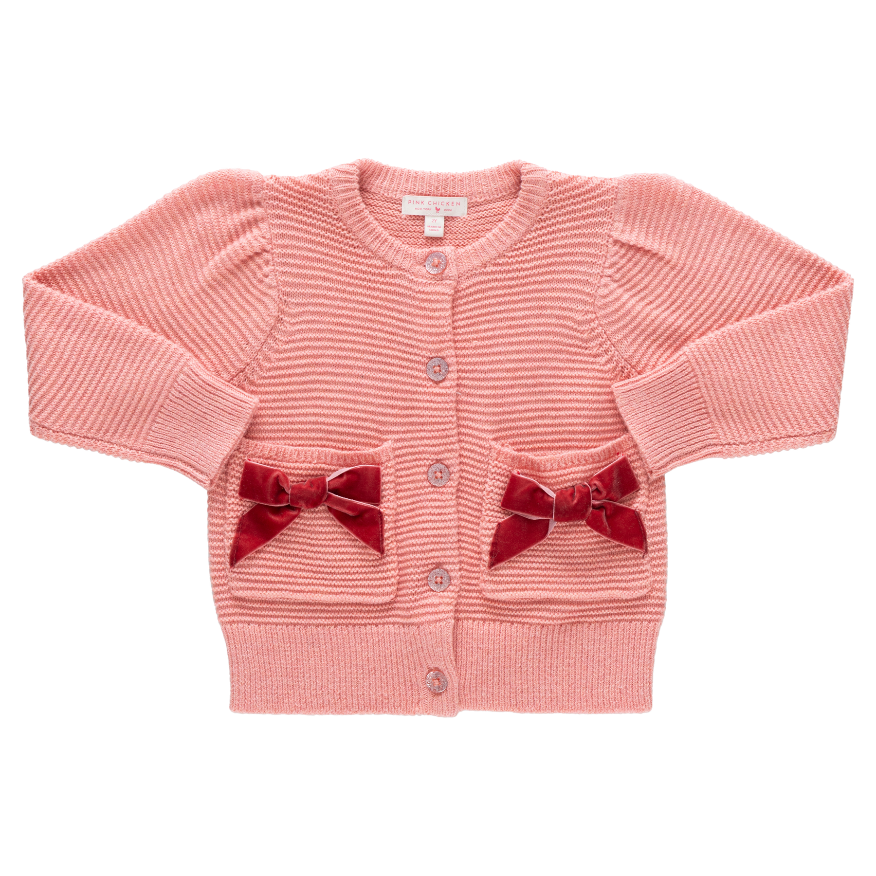 A cozy layer with the sweetest bow details! The Baby Girls Bow Pocket Sweater features fixed red velvet bows at the pockets for an extra charming touch. Finished with subtle glitter buttons, this soft knit sweater is perfect for layering over dresses and one pieces on cooler spring days.