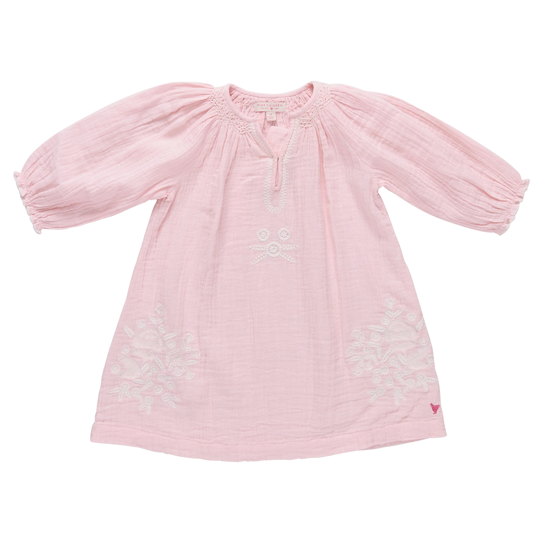 Soft, romantic, and designed for easy summer layering, the Ava Dress in Pink White Embroidery is the perfect beach-to-boardwalk piece. Made from airy cotton double cloth gauze, it features 3/4 puff sleeves with delicate white embroidery and a flattering V-neckline finished with a hook-and-eye closure. Intricate embroidery at the chest adds a thoughtful, vintage-inspired touch that feels special yet effortless.