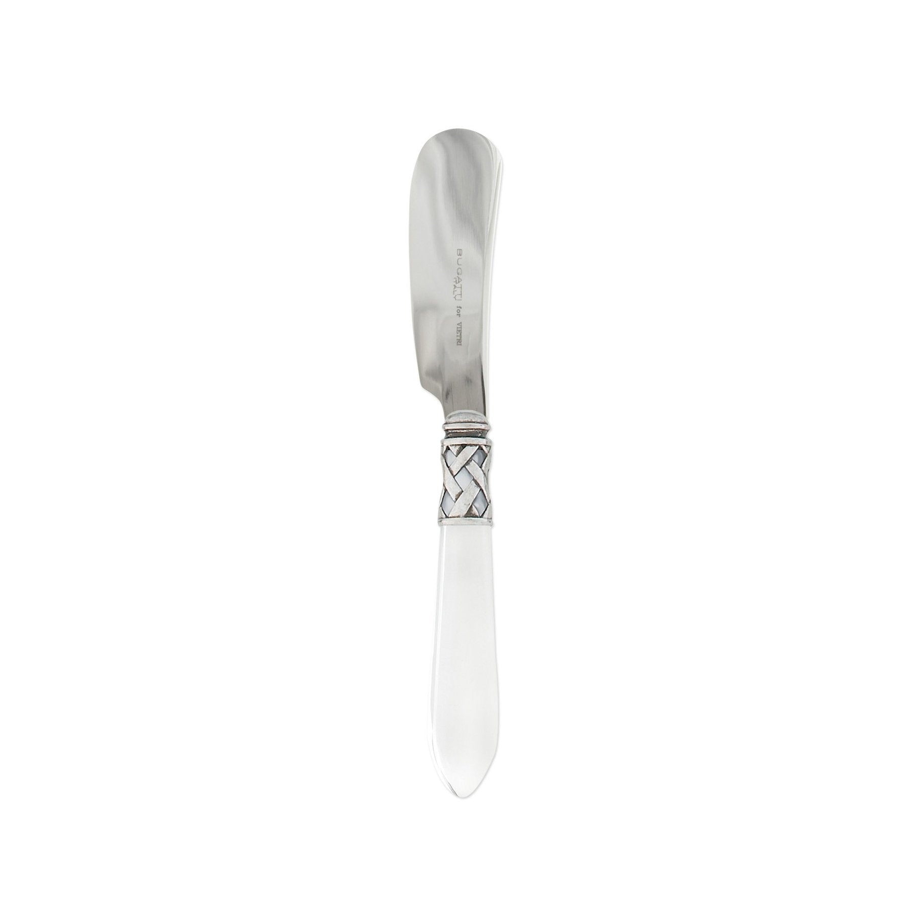 The Aladdin Small Spreader features elegant pearlized handles with the strength of high-grade acrylic and 18/10 stainless steel.