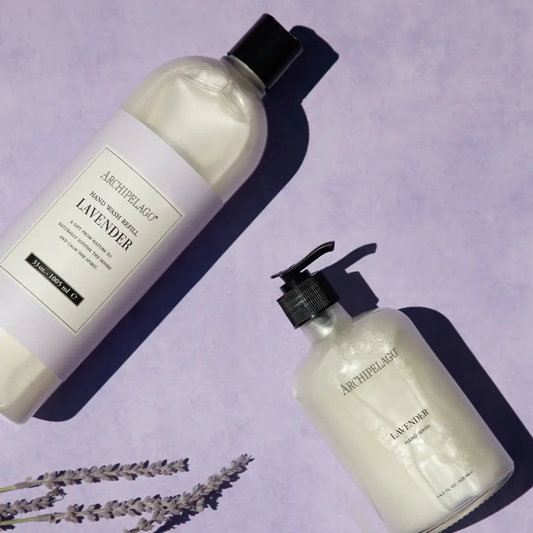 Our gentle Lavender Hand Wash effectively removes dirt and toxins without the drying effects of typical liquid soaps. A blend of five hand-selected essential oils—Bergamot, Lavender, Orange, Lemon, and Eucalyptus—enhances the soothing and therapeutic qualities of lavender, resulting in an amazing, everyday fragrance that calms. The product is packaged in a recyclable glass bottle that can be refilled with our 33 oz Hand Wash Refill, offering an eco-friendly solution that enhances both your skincare routine and your commitment to sustainability.