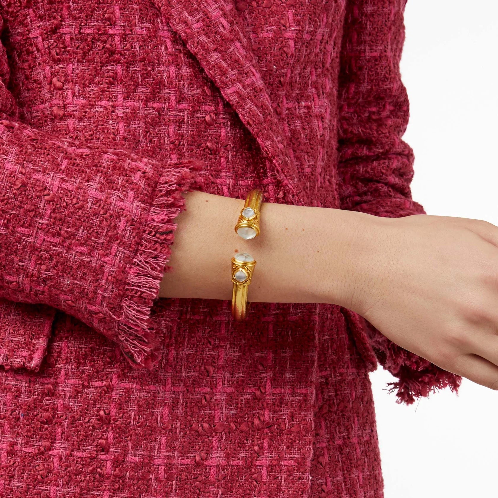 This opulent cuff features oval-shaped endcaps and diamond-shaped pearl accents and is designed with delicate piercework inside for lightness and luxury.