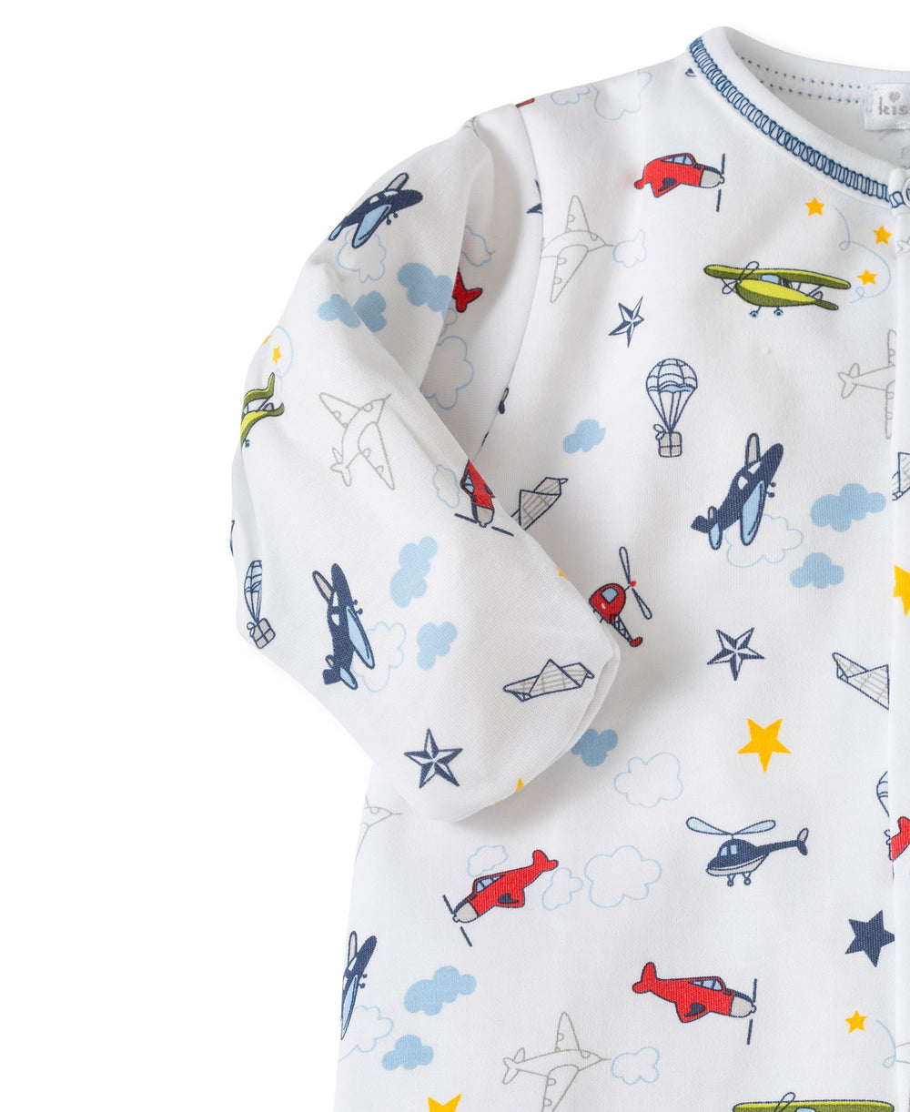Your little one will be ready for takeoff in this adorable Long Sleeve Footie. Made from luxuriously soft and breathable Pima cotton, it features a playful white background decorated with colorful airplanes, helicopters, paper airplanes, hot air balloons, clouds, and stars. Designed with an easy-to-use snap buttons for quick changes and cozy footed legs for all-night comfort, this sweet one-piece is perfect for bedtime cuddles and dreamy sky-high adventures.