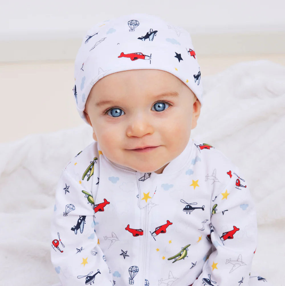 Keep your little one cozy and cute with this soft Cotton Hat, featuring a playful sky-themed print of airplanes, helicopters, hot air balloons, clouds, stars, and paper airplanes. Made from premium Pima cotton for a gentle, breathable feel, it’s perfect for keeping baby snug and stylish on every adventure.