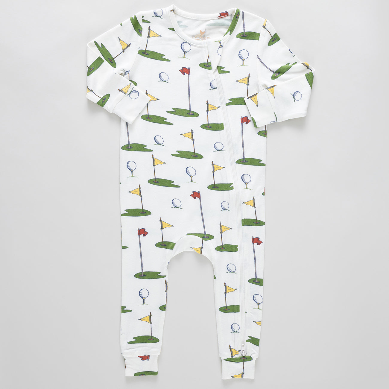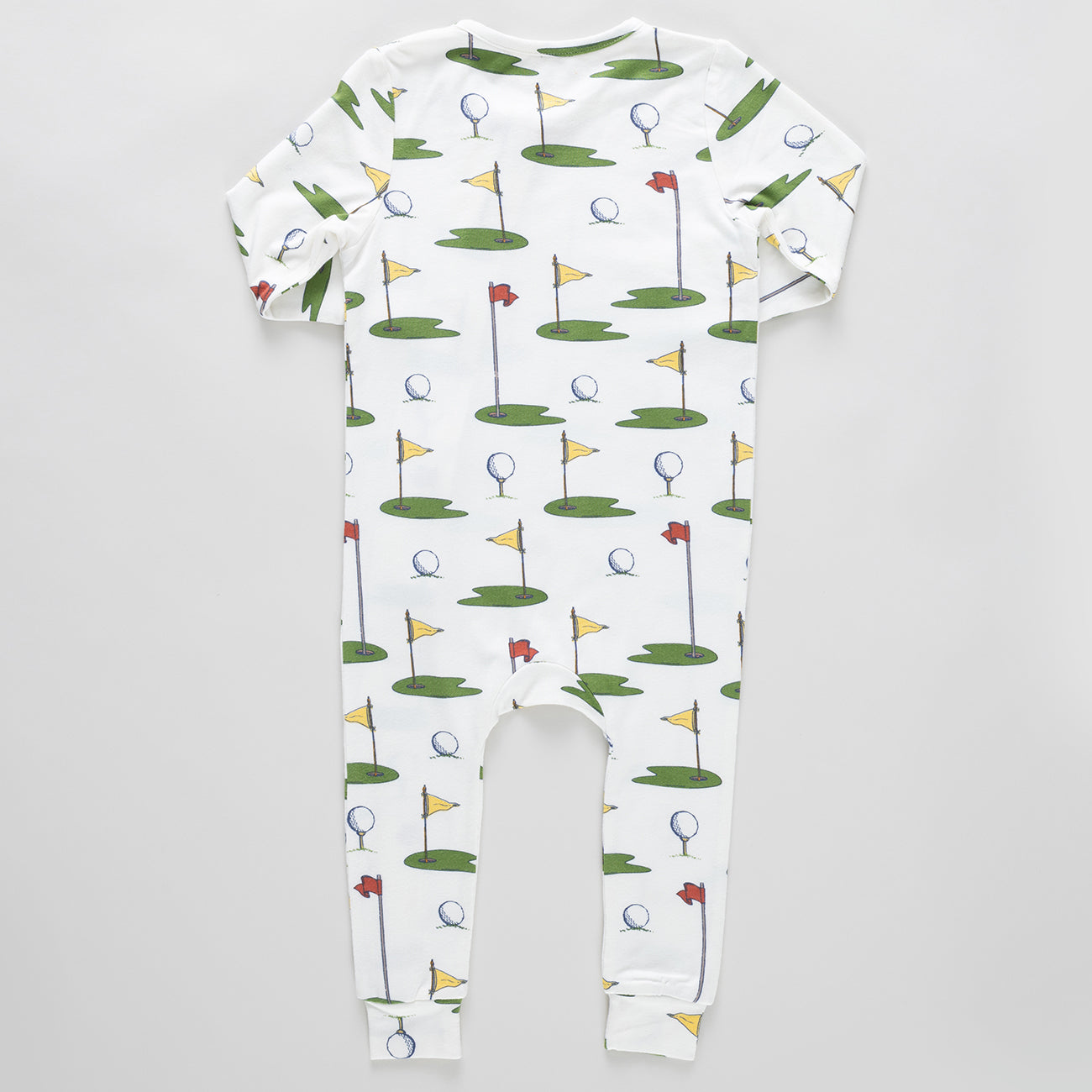 Tee time, but make it cozy! Our super soft Baby Bamboo Romper brings playful charm to everyday snuggles with our whimsical Cream Golf Tournament print. Designed with parents in mind, sizes 0/3m and 3/6m feature fold-over hand and foot cuffs for extra comfort, while a two-way zipper with a protective cover makes diaper changes quick and easy. Crafted from ultra-soft bamboo fabric with a smooth, silk-like feel, this breathable romper helps keep littles cool in warmer weather and comfy year-round.