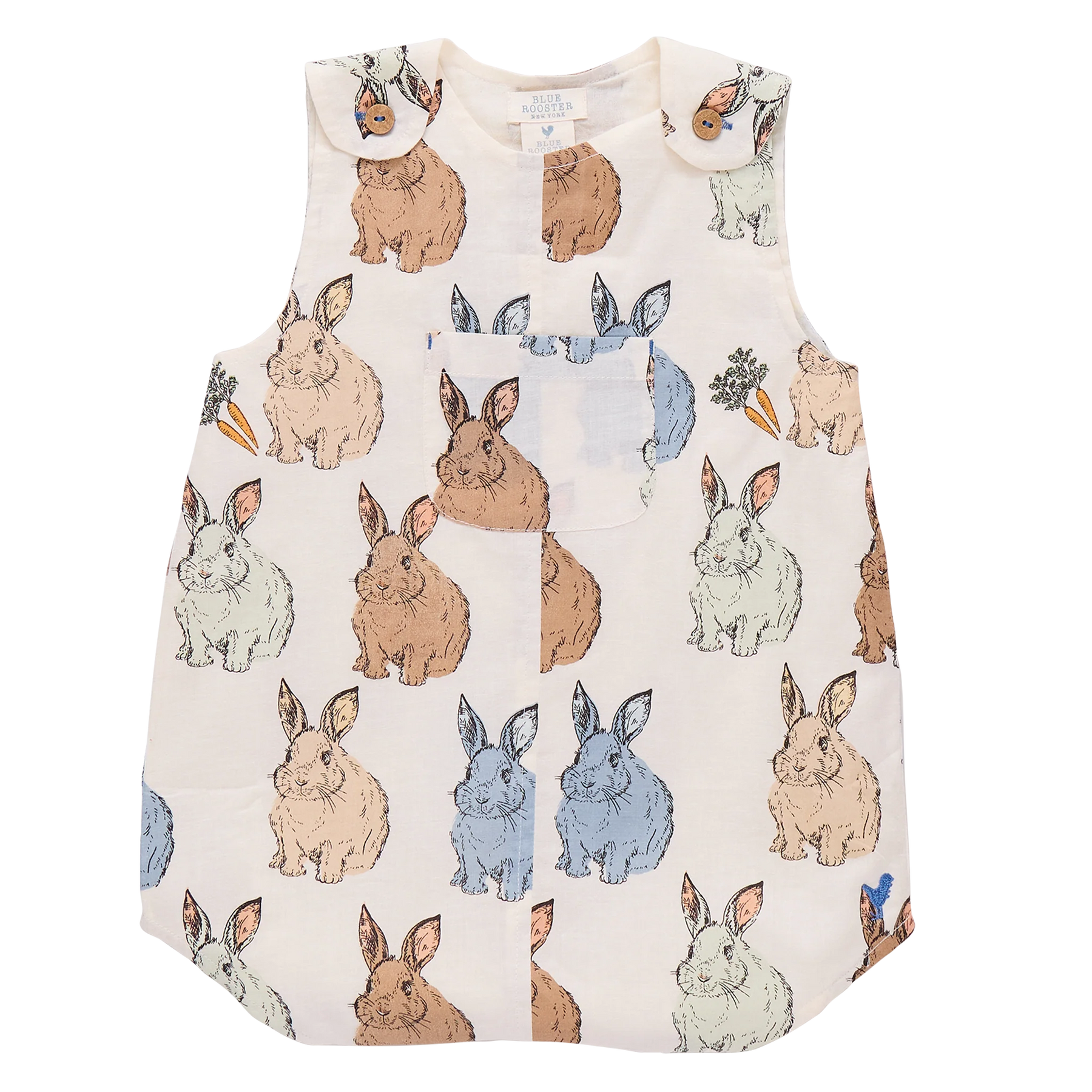 A springtime favorite with classic bunny charm! The Baby Boys Noah Jumper features a sweet blue vintage bunny print in soft 100% cotton. Designed with wood buttons at the shoulder for easy dressing and finished with a playful front pocket at the center chest, this timeless one piece is perfect for everyday wear and first Easter celebrations.