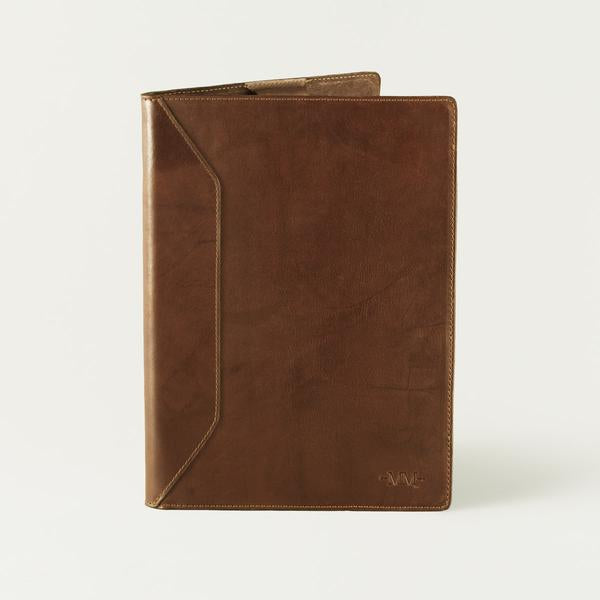 From time to time, even the most tech-engaged among us still value the analog sensation of putting pen to paper. For some, it is a daily practice. Screens of endless links, banners, and other blinking seductions are Grand Central Station at rush hour. The blank page, by comparison, is a zen garden where clear thought and fresh inspiration can bloom. For that, we've built a temple - a simple, stately full-grain leather folio that keeps a standard letter-size notepad, other documents or files, and a pen close at hand. Lined with pigskin suede, our padfolio features an inventive leather flap that snaps into place, securing the notepad at the top. Simple. Refined. Classic.
