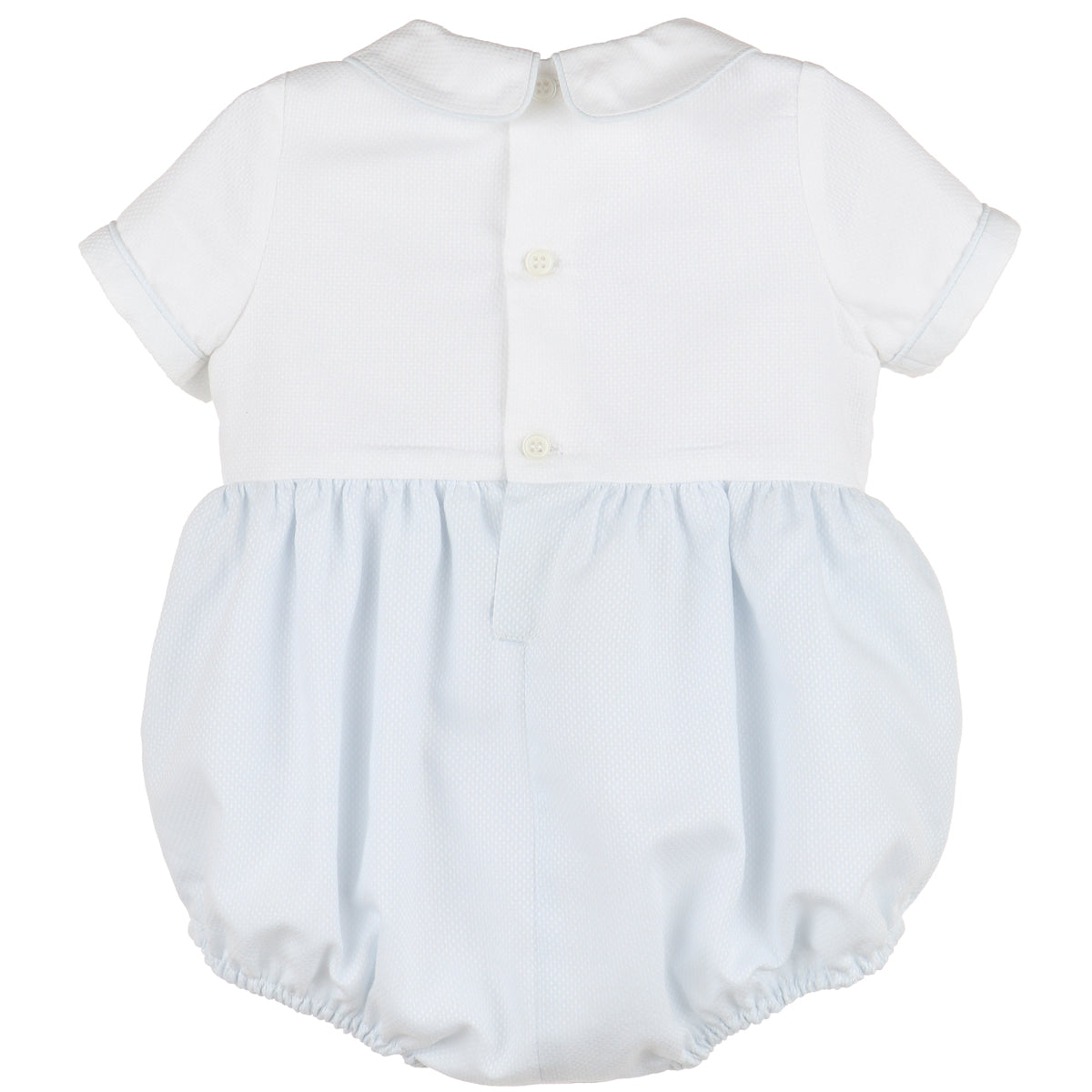 Indulge in luxury with our Blue Duotone Smock Bubble. This exclusive piece features a white chest with a delicate peterpan collar trimmed in a stunning baby blue. Complete with two buttons on the center chest and a smocked waist for a sophisticated touch. Perfect for your little prince.