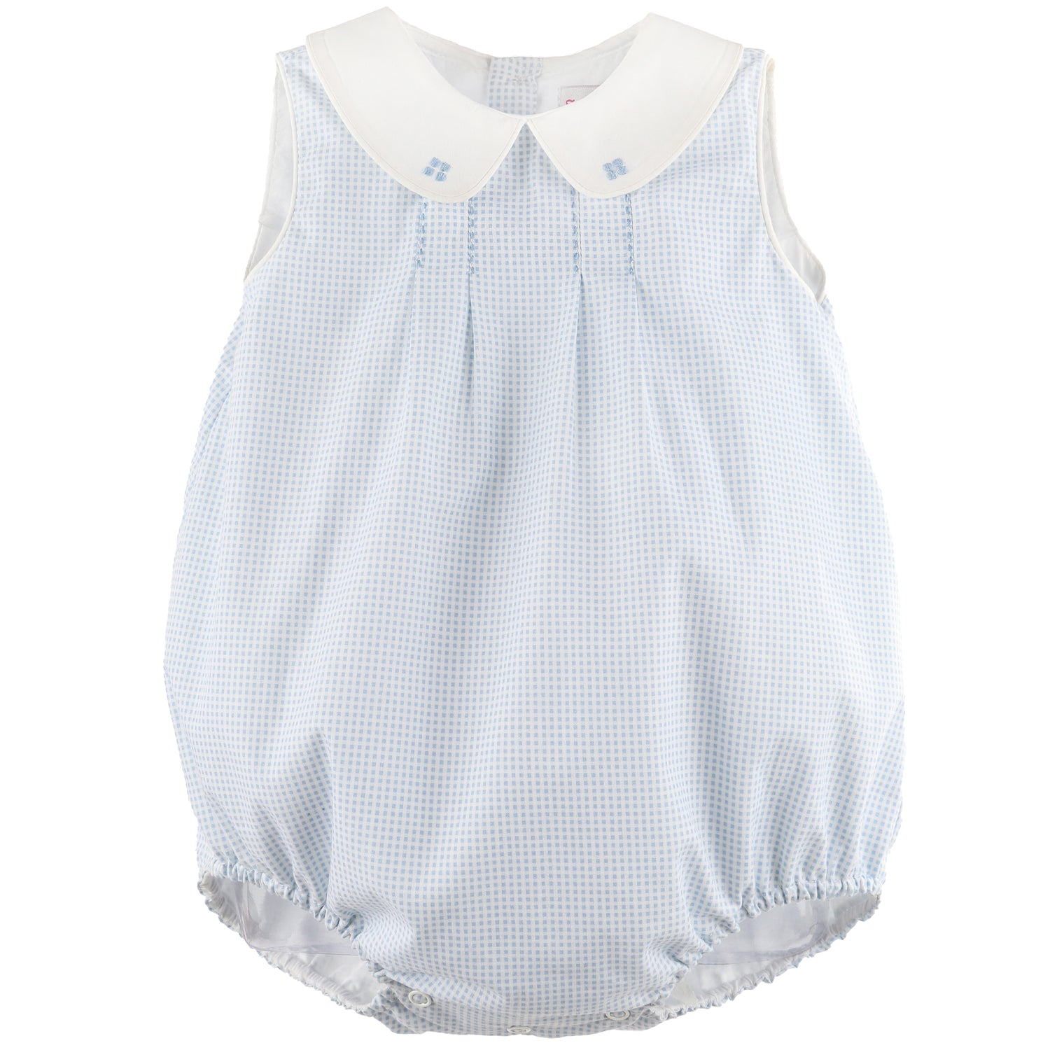 This charming baby boy bubble features a crisp white peter pan collar with embroidered blue geometric stitching that adds a dash of style. Classic stitched pleats on the chest create dimension. A delightful choice for both everyday wear and special occasions!