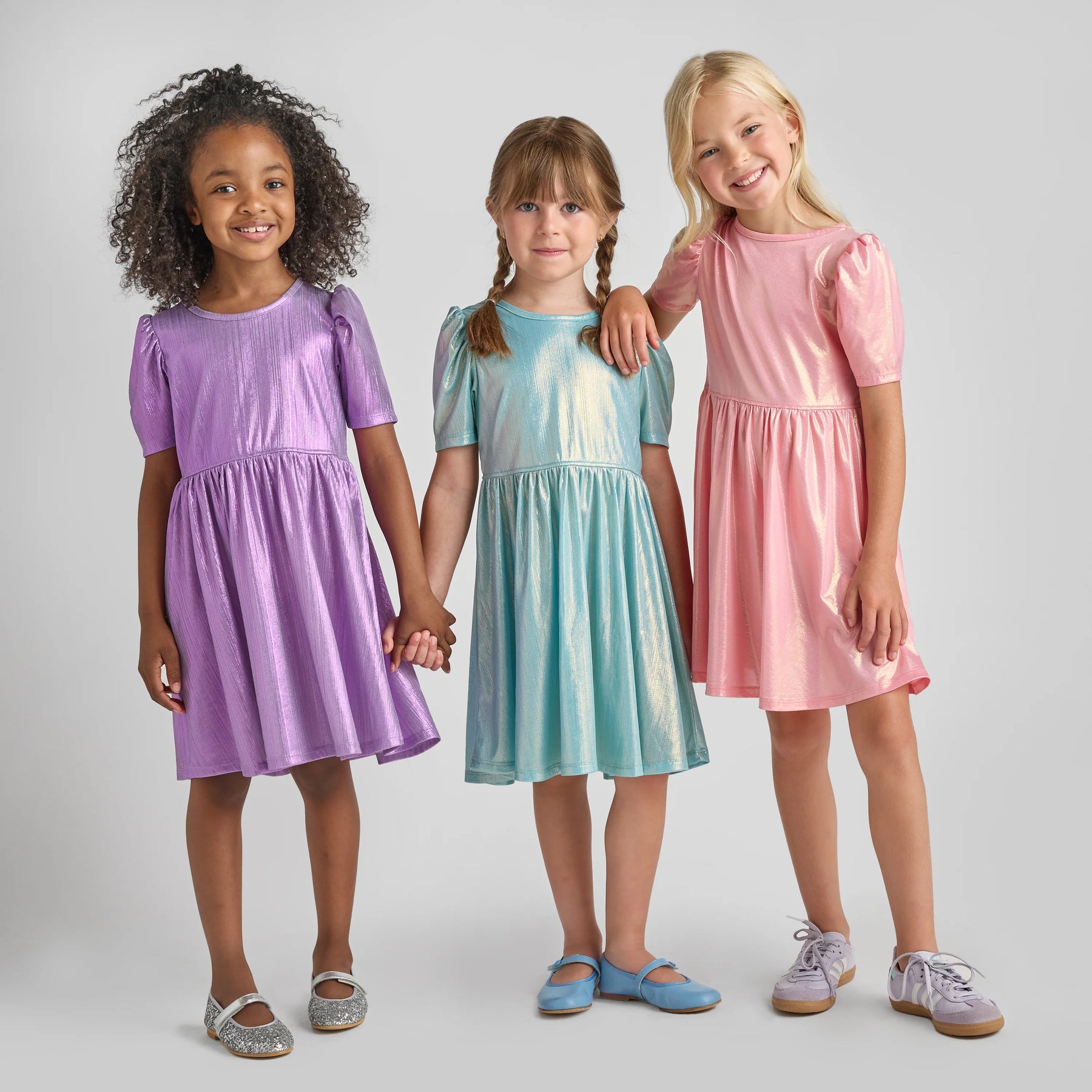 An instant party piece with a soft, luminous shine! Designed with puff sleeves and a gently gathered skirt, this ice blue lamé dress is perfect for celebrations, dress-up moments, and everything in between.
