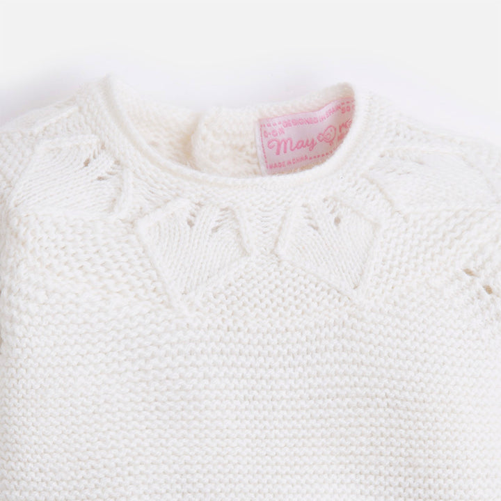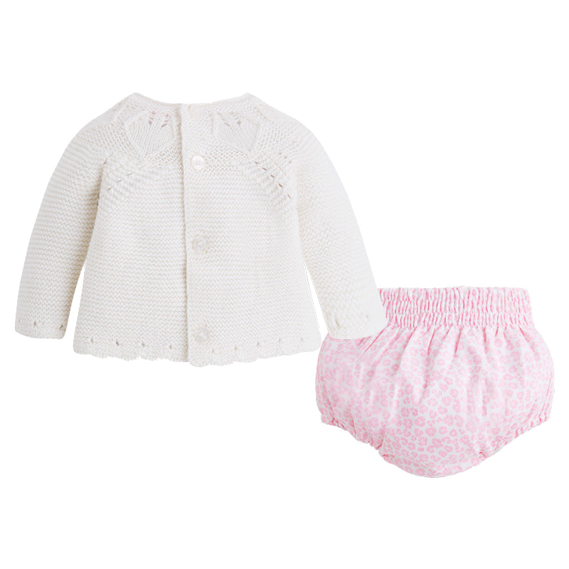 Adorable set in a classic style featuring a beautiful ivory sweater and matching sassy leopard bloomers that have a suede affect. Featuring a full button back on sweater and elasticized waist and legs on bloomers. Bloomers are topped off with a precious pink satin bow in the front. Pair with ivory tights, any of our little collared onesies as an undershirt, and our pink booties to get an irresistible look!