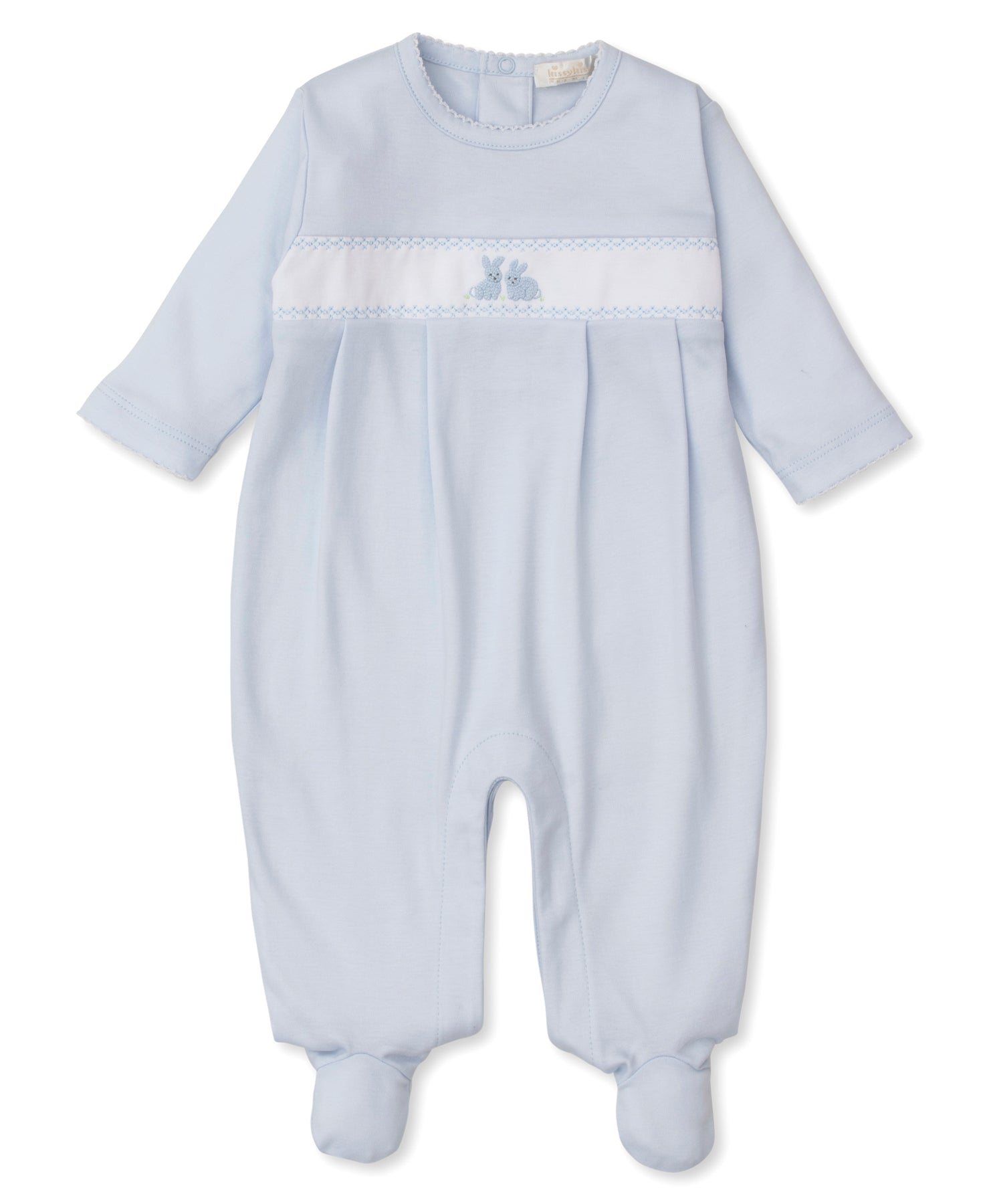 Featuring delicate hand-embroidered bunnies on this soft pastel blue footie from Kissy Kissy. With unparalleled softness, it features a convenient snap bottom and snap back for easy-breezy changes.