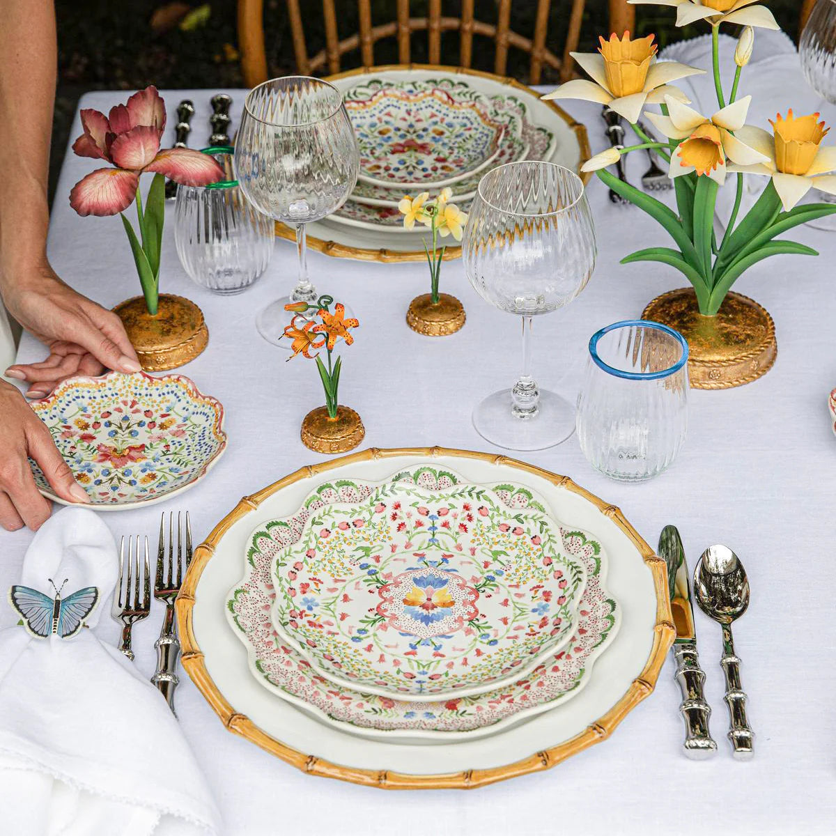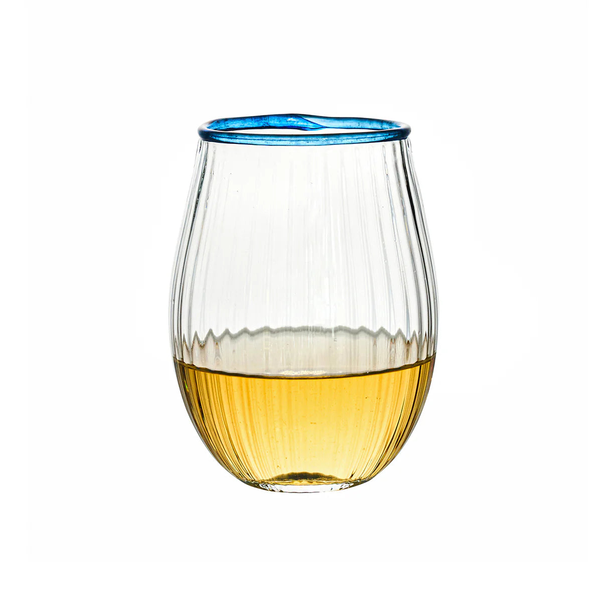 Our iconic Bohemian Glass is given a fresh and modern spin with a joyful wink of color. Chic and shimmering, each stemless wine glass ripples with intricate mouth blown glass and is rimmed with a happy hue to create pure cocktail-hour eye candy for everything from lemonade to wine to fun party drinks.