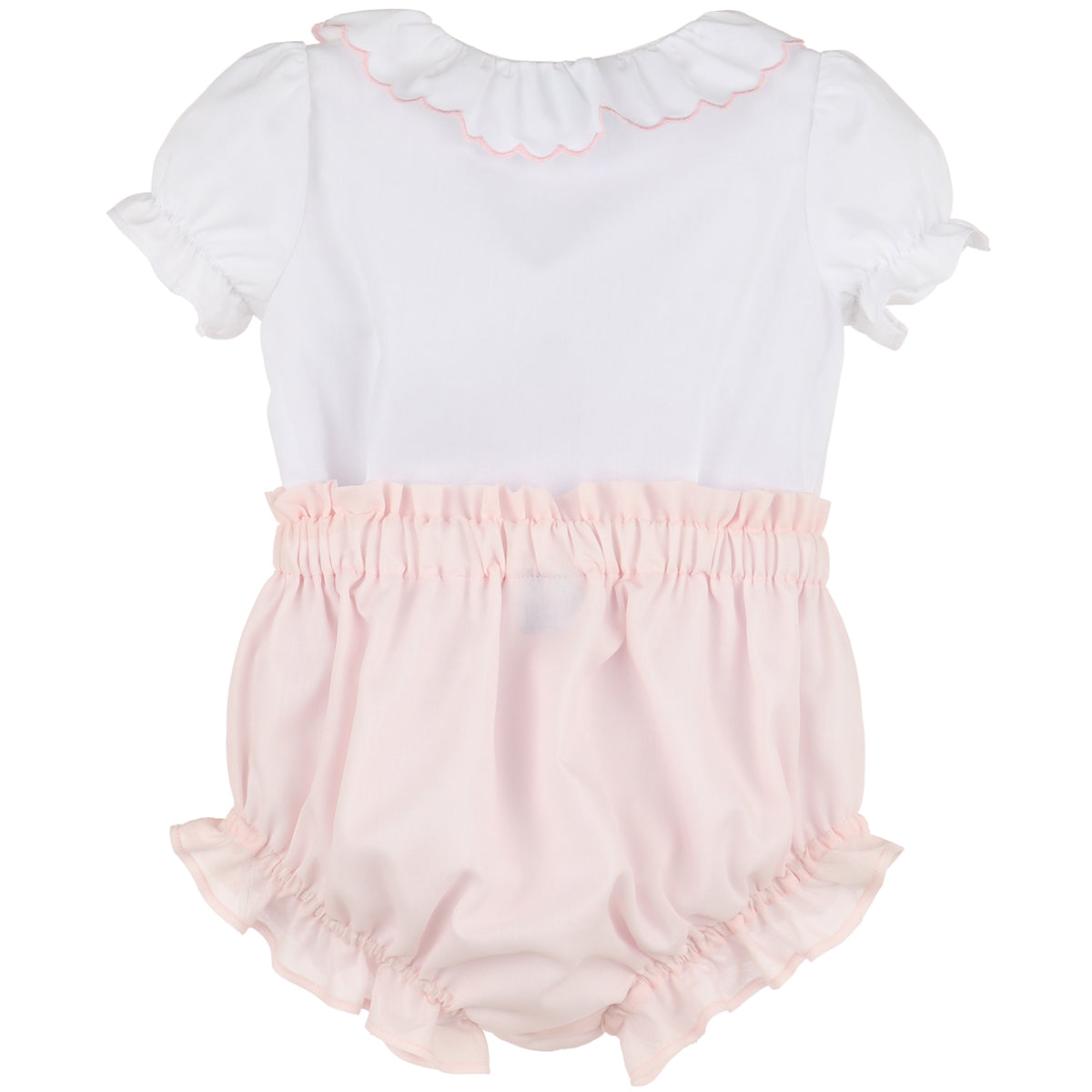 Introducing our Pink Classical Diamond Smock Set, perfect for your little fashionista. This exclusive set features a matching trim on a scalloped ruffle collar, a smocked waist on the bloomers, and delicate puff sleeves. With a touch of elegance and sophistication, your child will stand out in this luxury ensemble.