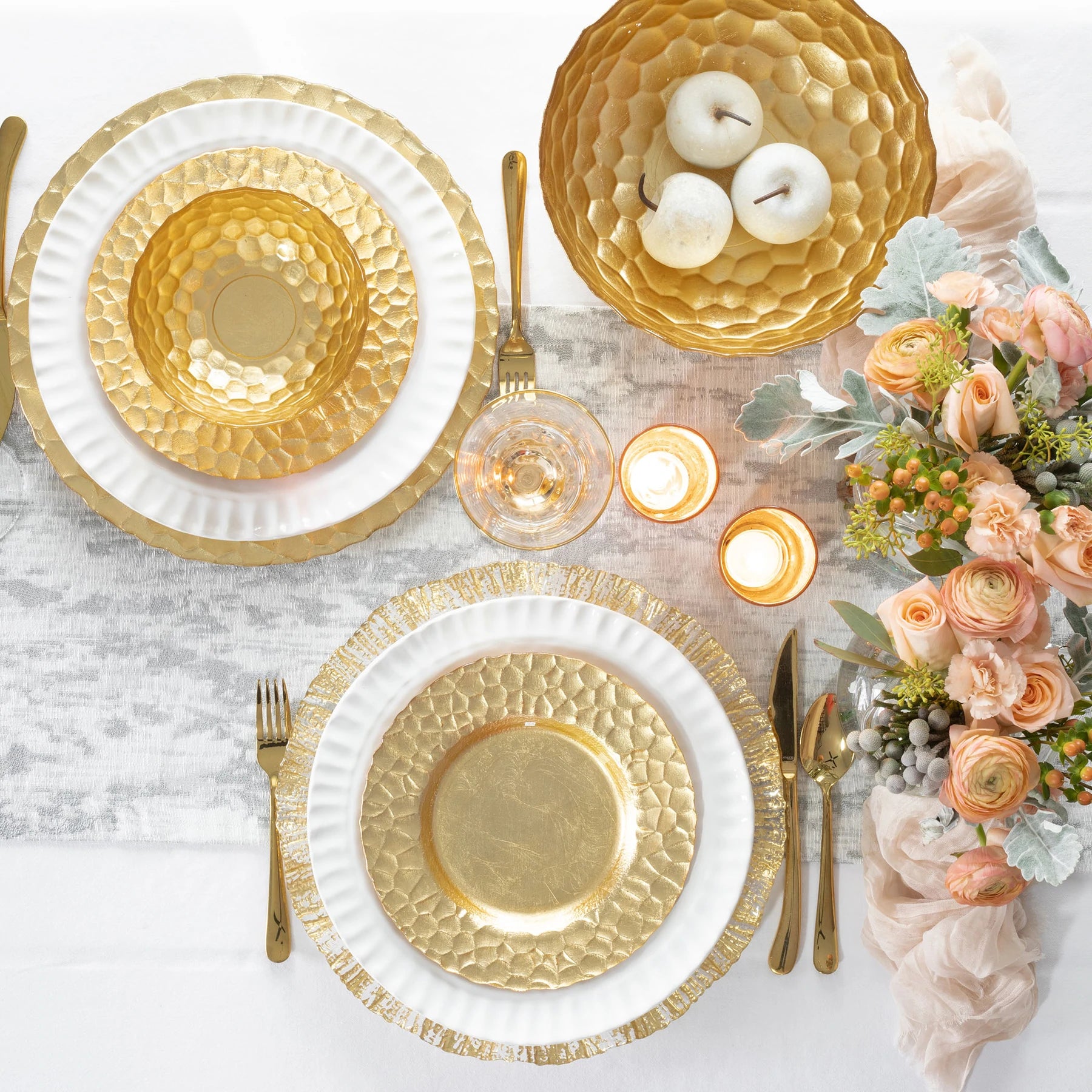 The Rufolo Glass Gold Honeycomb Small Bowl brings luster to your table. The glass piece features an organic, striking honeycomb pattern, and the final result makes a glimmering statement.
