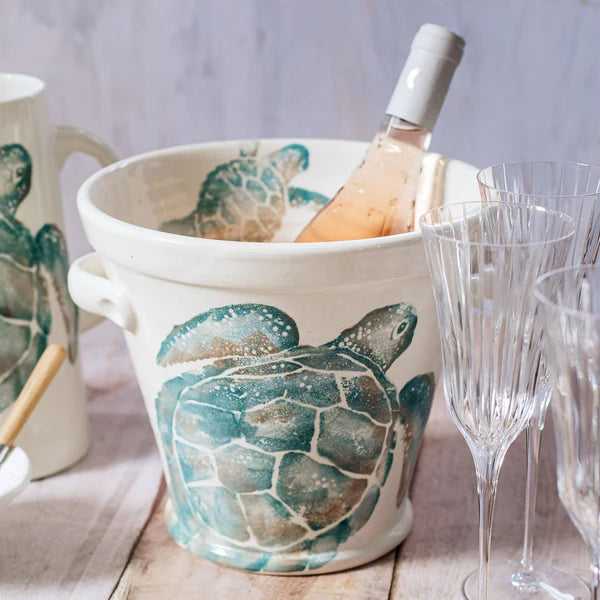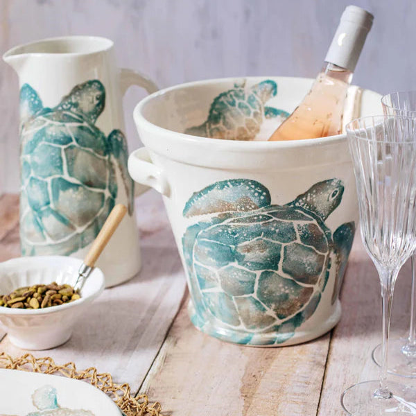 Handpainted sea turtles in hues of aqua and taupe glide across a clean, white canvas on the Tartaruga Ice Bucket. Maestro artisan, Gianluca Fabbro, utilizes a unique sponging technique to carefully add detail to each piece.